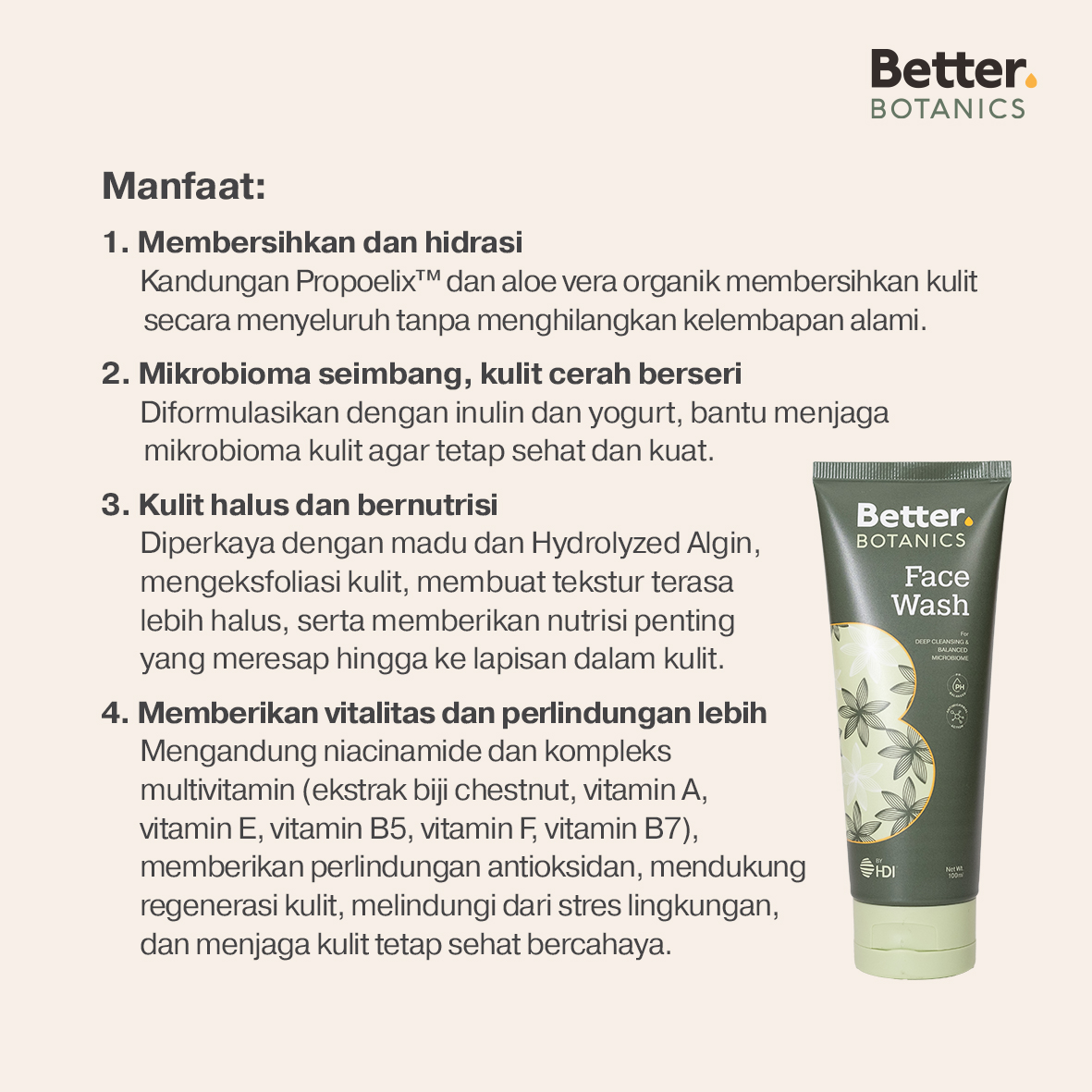 Pembersih wajah berbahan alami yang lembut dan aman, sekaligus bantu menjaga mikrobioma kulit tetap seimbang. Dengan formulasi Propoelix™ dan Multivitamin, produk ini solusi tepat untuk kulit sehat, bersih dan bercahaya sepanjang hari!