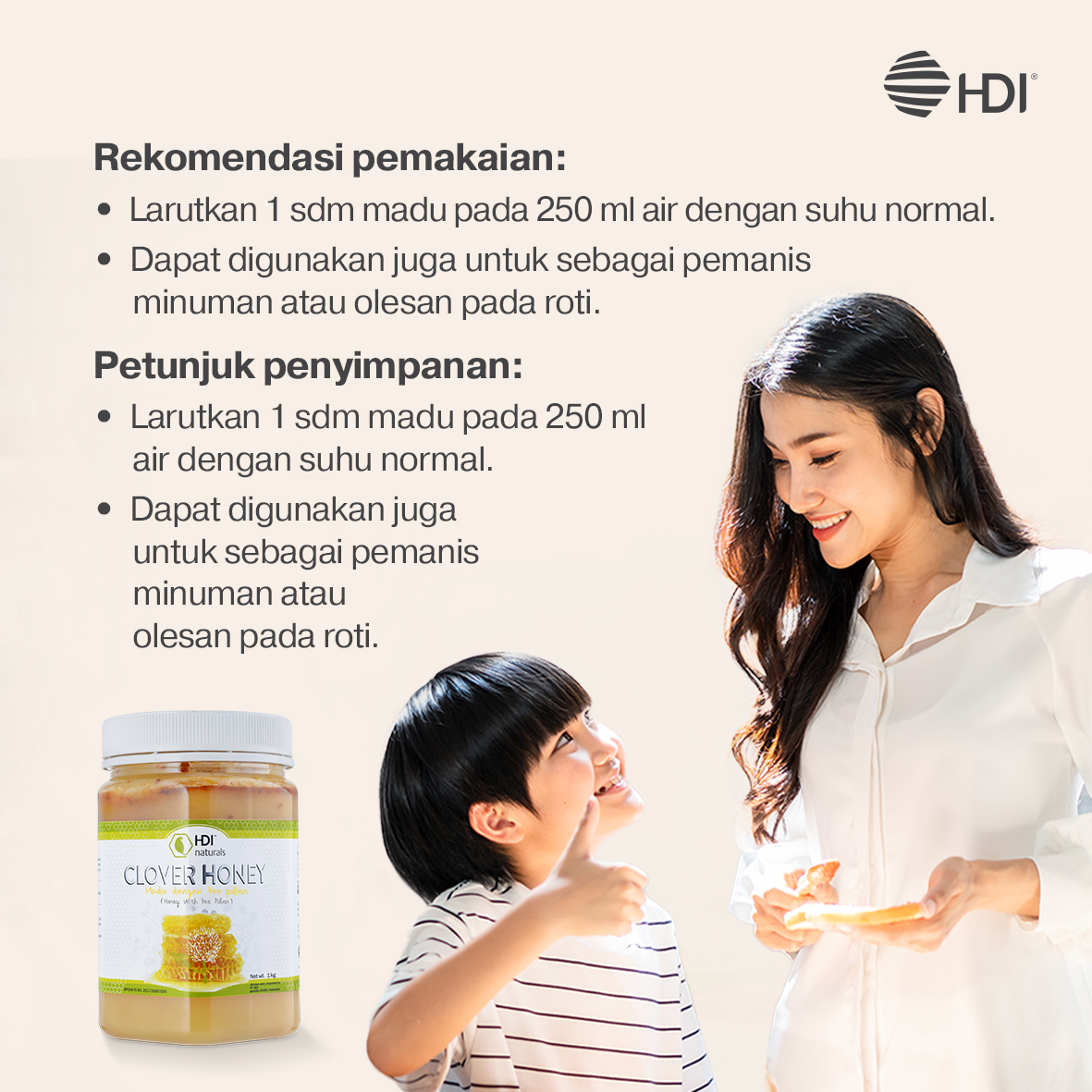 Larutkan 1 sendok makan HDI Clover Honey dalam segelas air atau pengganti gula dalam jus buah.